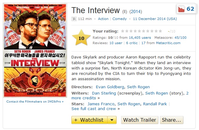 Still, it’s not as though the U.S. has no room to criticize. Kim Jong-un deserves to be ridiculed, and his people need to be shaken and inspired to throw off the shackles of his oppressive government. It’s hard to make a call on whether or not a movie is any good without having seen it, but it doesn’t seem like “The Interview” would have prompted such a thing. Reviews have been mostly unfavorable, and Franco and Rogen’s film holds about a 50 percent rating on both RottenTomatoes and MetaCritic (it has a 10/10 on IMDb, but those points are simply for solidarity). Their previous work has tended toward sophomoric slob comedy, on roughly the same spectrum as National Lampoon’s. It can be good stuff, but it doesn’t seem like we’re missing out on the next “The Great Dictator” or “Duck Soup.” Were it not for the controversy, “The Interview” would probably have been released and quickly forgotten.